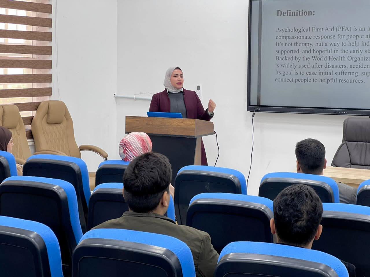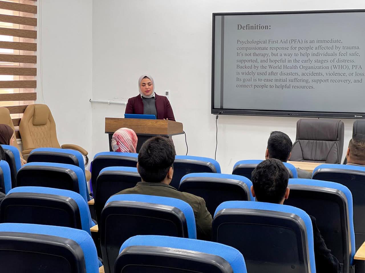 وهدفت الورشة إلى تعزيز الوعي الصحي ولاسيما الصحة  النفسية، والتعريف بمفهوم الإسعافات الأولية النفسية وأهميتها في التعامل مع الأفراد الذين يتعرضون لضغوطات نفسية أو حوادث أو أزمات طارئة، فضلاً عن تنمية مهارات الفرد في تقديم الدعم النفسي الأولي الذي يُعد خطوة أساسية في مساعدة الشخص على تجاوز الصدمة والحد من آثارها السلبية.