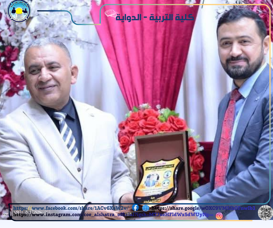 كما شهدت الاحتفالية تكريم السيد المساعد العلمي لرئيس الجامعة أ.م.د فاضل محسن حمد، من قبل السيد عميد كلية التربية، تثمينًا لجهوده المباركة ودعمه المتواصل للأنشطة العلمية والأكاديمية في الجامعة.